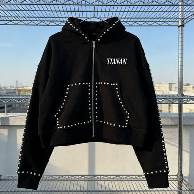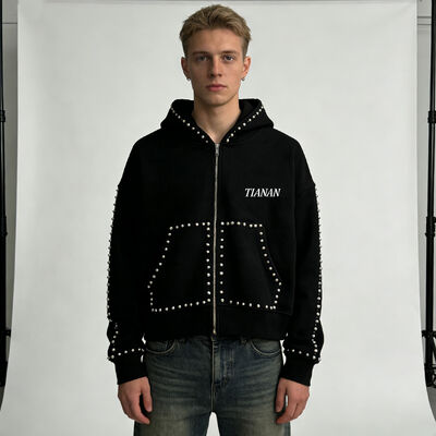 Φούτερ με φερμουάρ και πέρλες για άνδρες, κατασκευαστής, προσαρμοσμένο, βαριάς ποιότητας, βαμβάκι French Terry, στρας, μαύρο, ανδρικό φούτερ με κουκούλα
