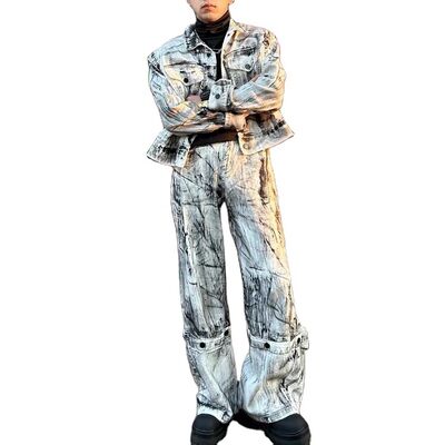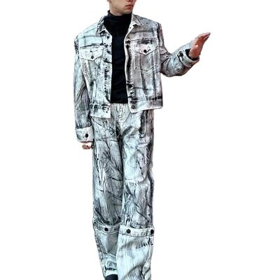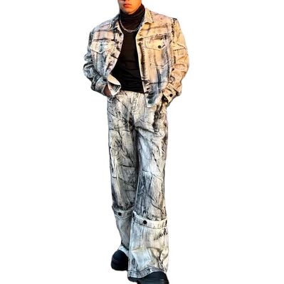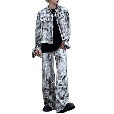 Προσαρμοσμένος σχεδιαστής υψηλής ποιότητας βίντεζ βρώμα καταστροφή τζιν Sweatsuit ρούχα δρόμου γυμναστικό τζιν παντελόνια και μπουφάν 2 κομμάτια σύνολο