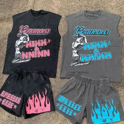 Προσαρμοσμένο Streetwear Screen Printing Καλοκαιρινό Σετ Μπλουζάκι και Σορτς για Άνδρες με Στρογγυλή Λαιμόκοψη και Αμάνικα Μπλουζάκια Sweatsuit με Οξέα Πλύση