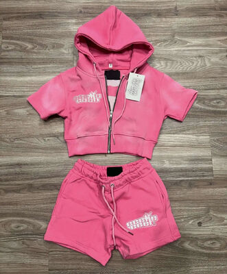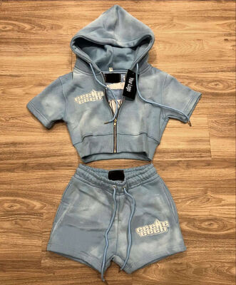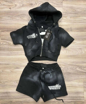 Conjunto de 2 peças de moletom com zíper de algodão com lavagem ácida, estilo streetwear, para corrida, feminino, camiseta e shorts, fabricante de roupas