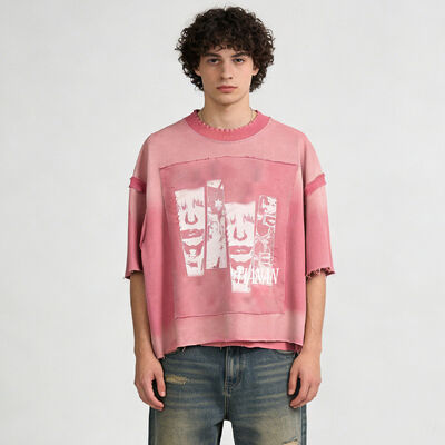 Shorts de manga curta oversized cropped com estampa acid wash e efeito distressed, estilo streetwear hip hop, fabricado sob medida