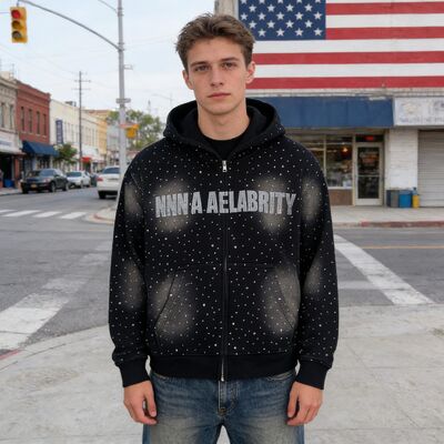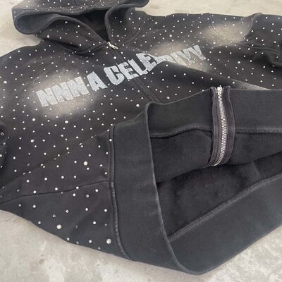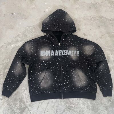 Heavyweight Rhinestone Mens Clothing Streetwear Hip Hop Acid Wash Hoodie for Men Manufacturer Custom Zip up Black Cotton Hoodies