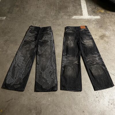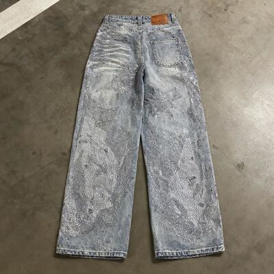 Custom Rhinestone Personality Men's Trousers Hip Hop Style Baggy Pants Mid Waist Woven Denim Washed Loose Straight Autumn Jeans 0