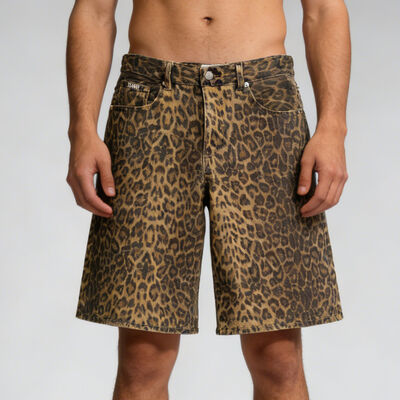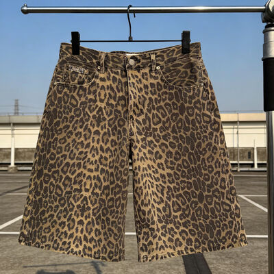Custom Heavyweight Brown Fashion Streetwear Men's Denim Shorts High Quality Leopard Print Flared Knee Length Outdoor Shorts