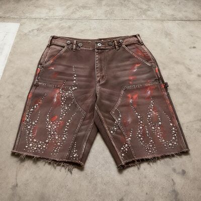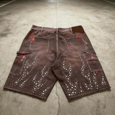 OEM ODM Custom Logo Graphic Printing Pocket Pants Relaxation Distress Wash Raw Edges Rhinestone Y2k Cargo Denim Shorts for Man