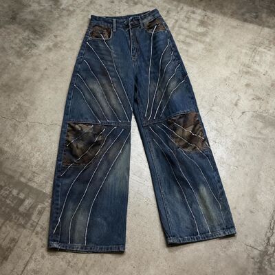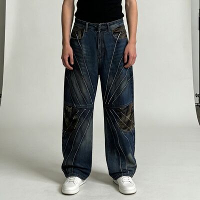 Custom Wholesale Y2K Cut Wide Leg Flared Distressed Vintage Denim Pants Web Graphic Printed Logo Dark Blue Hip Hop Baggy Jeans