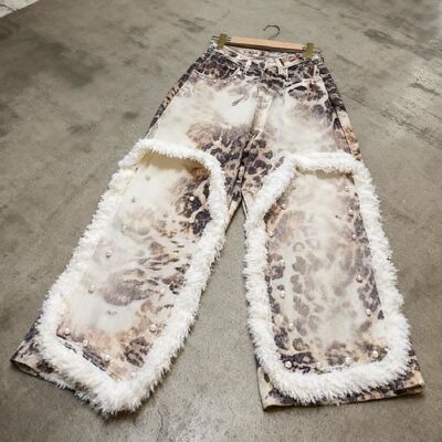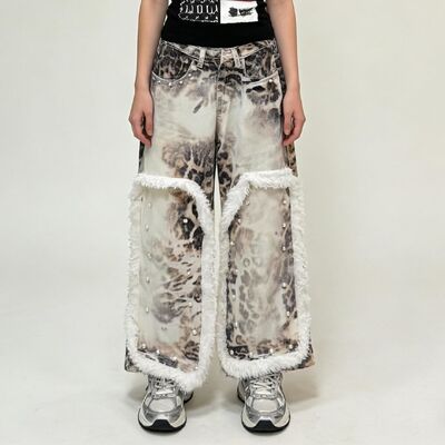 Custom Leopard Street Wear Style Cargo Pants Vintage Graphic Dark Wash Exquisite Personalized Casual Denim Pearl Women's Jeans