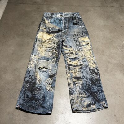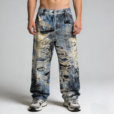 Custom 3D Digital Printed Distressed Graffiti Vintage Loose Wide Leg Jeans Baggy Streetwear Hip Hop Style Y2K Long Men's Pants