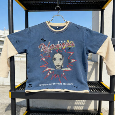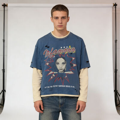 Custom Cotton Thermal Waffle Knit Double Layer Long Sleeve Acid Washed Distressed Rips Print Rhinestone Oversize Boxy T-Shirt